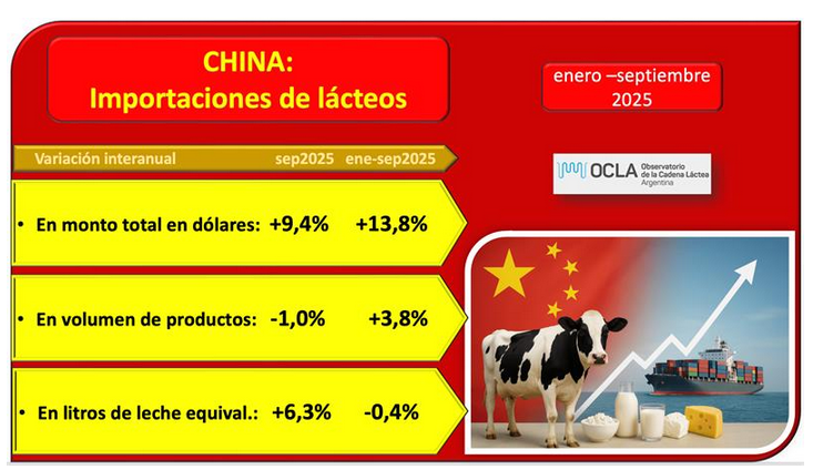 El Valor por Litro de Leche Equivalente de las importaciones de China en el acumulado de 2025 fue de US$ 1,14 (subiendo un 14,3%), cuando el Valor por Litro Equivalente de las exportaciones totales de Argentina a todos los destinos para igual período, fue de US$ 0,57/litro.